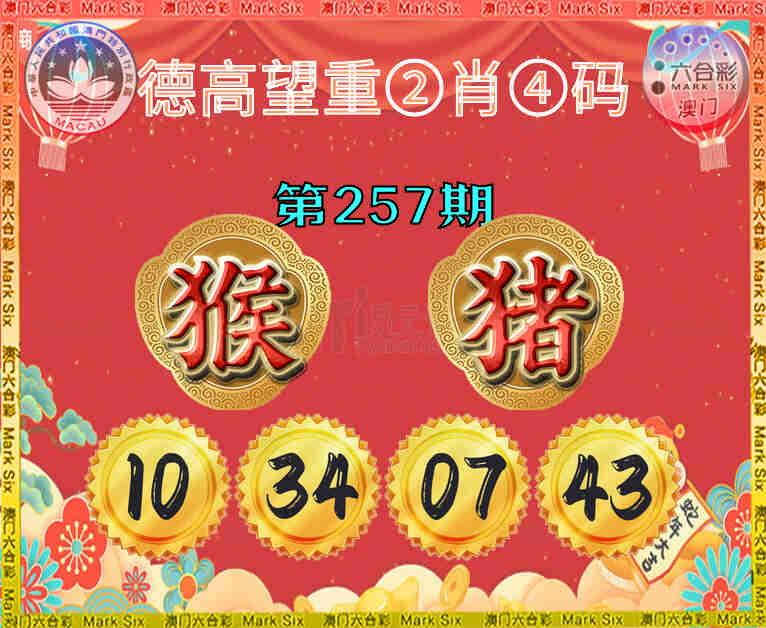 257期:《德高望重》 🗡②肖④码🗡【猴猪】【10.34.07.43】开:虎28